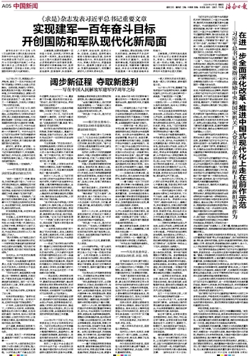 文章强调,如期实现建军一百年奋斗目标,加快把人民军队建成世界一流军队,是全面建设社会主义现代化国家的战略要求。必须贯彻新时代党的强军思想,贯彻新时代军事战略方针,坚持党对人民军队的绝对领导,坚持政治建军、改革强军、科技强军、人才强军、依法治军,坚持边斗争、边备战、边建设,坚持机械化信息化智能化融合发展,加快军事理论现代化、军队组织形态现代化、军事人员现代化、武器装备现代化,提高捍卫国家主权、安全、发展利益战略能力,有效履行新时代人民军队使命任务。