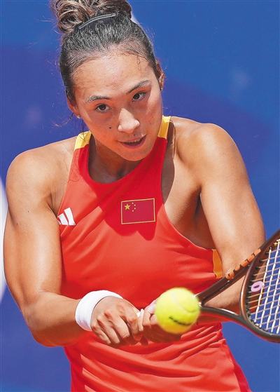 在北京时间7月31日晚结束的巴黎奥运会网球女单1/4决赛中,中国球员郑钦文再次上演逆转好戏,打满3盘用时3个小时,最终通过决胜盘抢七以2:1(6:7、6:4、7:6)击败德国老将科贝尔,晋级女单四强。图为郑钦文在比赛中。新华社发