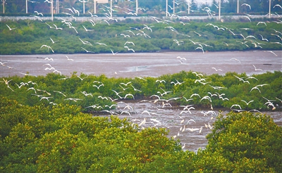 白鹭在海口市东寨港湿地觅食。