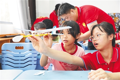 8月1日,在文昌市锦山镇花园村溪尾小学,海南省农垦中学志愿服务队志愿者指导孩子们制作航模,让孩子们通过亲手制作和调试航模,直观地感受到科学的魅力,从而激发他们对科学的兴趣,同时也为暑期增添乐趣。海南日报全媒体记者 陈若龙 通讯员 王大林 图/文