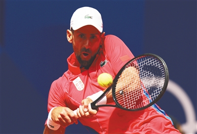 当地时间8月4日,在巴黎奥运会网球项目男单决赛中,第五次征战奥运会的塞尔维亚选手德约科维奇击败西班牙选手阿尔卡拉斯,夺得职业生涯首枚奥运金牌。同时,德约科维奇也达成职业生涯金满贯。图为德约科维奇在当天比赛中回球。新华社发