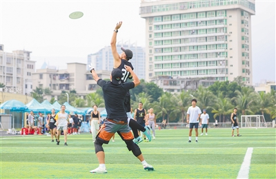飞盘的玩法简单,对抗不强,男女可混合参赛,组队灵活,也无裁判。飞盘运动对场地要求不高,有一小块空地即可,参与者掌握简单的抛、接技巧就能上场,人数多少均可,甚至几个朋友拉入两三名陌生人也能一拍即合玩起来。如今,每到周末,在海口万绿园、世纪公园等地,飞盘是最受小朋友欢迎的运动项目。