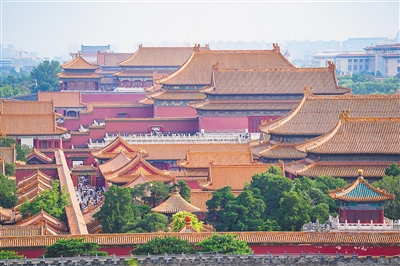 从建筑格局上看,北京中轴线连着四重城(即外城、内城、皇城和紫禁城),有如全城的脊梁;北京城则像一个巨大的“中”字,“中”字的中心就是皇宫紫禁城,紫禁城由皇城、内城、外城层层拱卫,体现了传统皇帝“居天下之中”的基本理念。