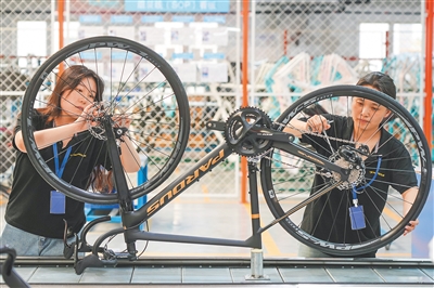 在山东泰山瑞豹复合材料有限公司生产车间,工人在组装碳纤维自行车。泰山体育为巴黎奥运会的摔跤、自行车、跆拳道、体操、田径等比赛提供器材。新华社发