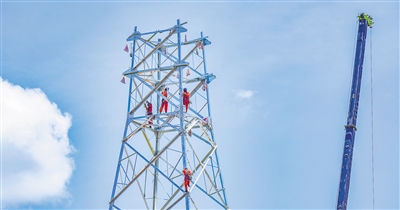 海南连日持续高温,正是海南的用电高峰,电网工作人员加快完善电网线路建设,保障企业生产和居民生活用电正常。