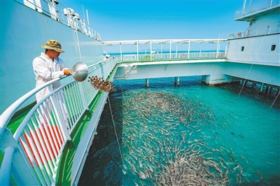 在乐东龙栖湾海洋牧场3号养殖平台,工人为鱼群投喂饲料。
