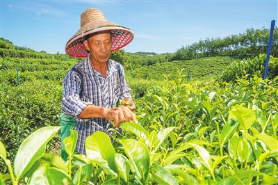 8月6日,在琼中黎族苗族自治县海垦热作产业集团乌石白马岭茶园,职工在采茶。
