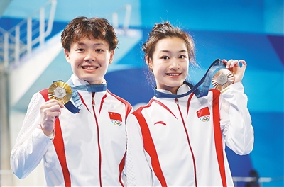 8月9日,中国选手陈艺文(左)、昌雅妮在颁奖仪式后合影。当日,在巴黎奥运会跳水项目女子三米板决赛中,陈艺文获得金牌,昌雅妮获得铜牌。新华社记者 张玉薇 摄