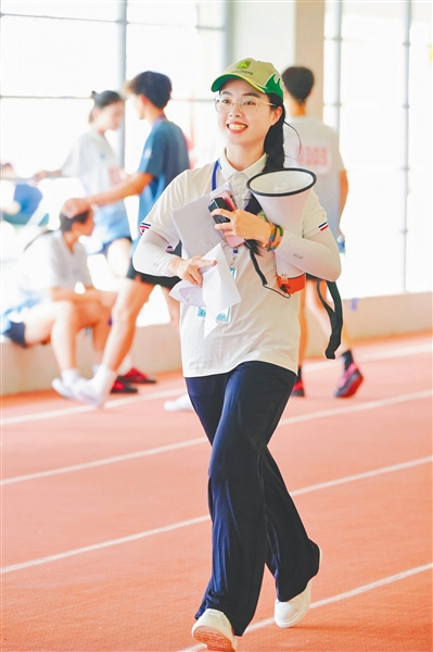 ③ 志愿者在运动会测试赛中工作。通讯员 黄东光 摄