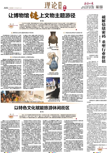 其次,推进博物馆参与旅游景区创建。博物馆本身具有空间布局合理、配套设施齐全、服务质量较好、便于开展教育活动等优势,这是成为旅游景区的基础条件。探索博物馆参与旅游景区创建机制,顺应国家文物主题游径建设需要,也是地方旅游强省战略的重要举措。例如,游客可以先在海口骑楼博物馆概览南洋文化特征,再走进海口骑楼建筑历史文化街区、深入天后宫等文保单位参观,品尝海南非遗美食,住骑楼民宿,这种通过小型博物馆来串联旅游景点的方式,既方便了游客的线路规划,又加深了游客对旅游目的地的文化理解与记忆。这就是以博物馆品位增强景区的文化内涵,形成“博物馆”与“景区”的优势互补,从而形成具有一定规模的博物馆文化景区。