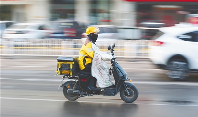 在山东省滕州市善国路,一名外卖小哥为顾客送餐。 新华社发