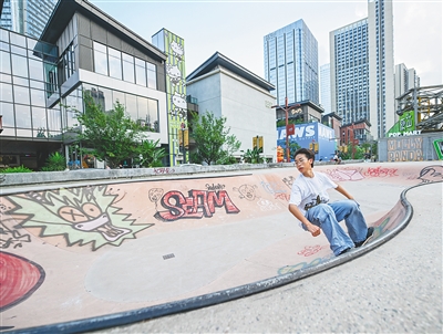 在成都市东郊记忆户外滑板场,爱好者在练习滑板。新华社发