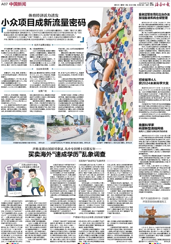 《中国证券报》16日刊发文章《体育经济活力迸发 小众项目成新流量密码》。文章称,“最近几年,攀岩运动爱好者越来越多,越来越受关注。”北京市丰台区攀岩馆教练陆文强近日向中国证券报记者介绍,“在巴黎奥运会期间,我们馆的客流量比平时大概增加30%,很多客户是在看完攀岩比赛后过来尝试的。”记者放眼馆内,只见岩壁上“长满”了爬墙的人。业内人士表示,在奥运效应和暑期效应带动下,攀岩、冲浪、滑板等小众运动项目掀起热潮,拉动体育消费增长,为体育经济活力持续迸发注入新动能。
