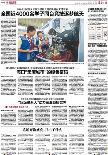 本报文城8月17日电(海南日报全媒体记者刘梦晓)8月17日,以“仰望星空 成就梦想”为主题的2024全国青少年航天创新大赛总决赛在文昌开幕。来自全国31个省、自治区、直辖市及港澳地区的3934名青少年航天爱好者参与,共同开启一场探索宇宙、成就梦想的科技盛宴。可以自动升降的火箭模型、能在微波控制下转向的探测器……比赛现场,学生们纷纷亮出“家底”,展现各自在航天领域的畅想与探索。浙江火星梦之队,带着他们自制的火星探测基站来到大赛现场。“希望能通过参加比赛展现我们的想法,更希望有一天我们的想法能够变成现实。”火星梦之队选手严允昊说。