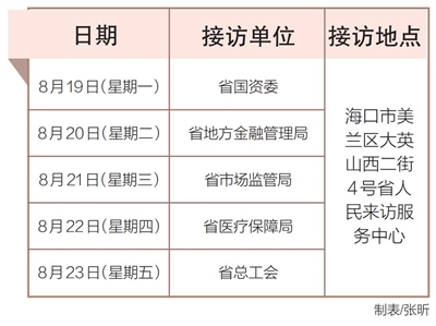 8月19日至23日,省国资委、省地方金融管理局、省市场监管局、省医疗保障局、省总工会相关负责人将在海口市美兰区大英山西二街4号省人民来访服务中心接访群众。