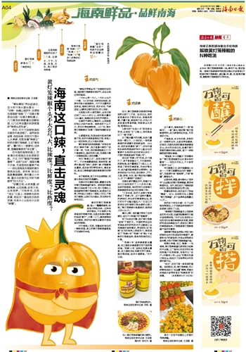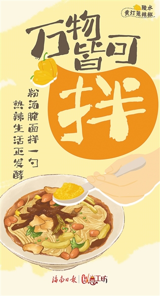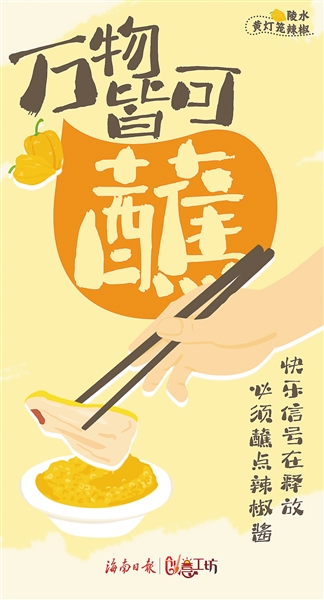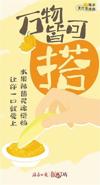 本报海口8月18日讯 (海南日报全媒体记者周钰)黄灯笼辣椒鲜辣一绝,辣而不呛,唇齿留香。海南日报新媒体特别策划推出手绘海报《万物皆可黄灯笼辣椒》,通过蘸、拌、搭、用、配等关键词,解锁黄灯笼辣椒的N种吃法。