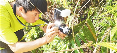 吕天朗在野外拍摄一只蜥蜴。