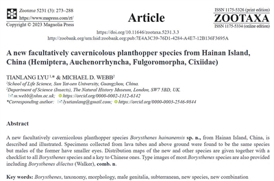 完成对比工作后,我确定生活在海口洞穴里的这种蜡蝉是一个新物种。2022年,我开始撰写分类学论文描述该新物种。2023年初,该新物种以《一个来自海南岛的兼性洞穴化蜡蝉新物种》为题发表在国际动物分类学期刊《Zootaxa》上,以其产地命名为“海南帛菱蜡蝉”。这是一个海南岛的特有物种,也是中国境内报道的第一种洞穴蜡蝉。