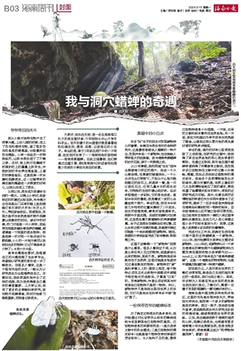 ■ 吕天朗大家好,我叫吕天朗,是一名在海南海口长大的昆虫爱好者,今年刚刚从中山大学本科毕业。我平时最大的兴趣爱好就是拿着相机和捕虫网,搜寻、观察、记录身边的小虫子。幸运的是,缘于3年前在洞穴中的一次奇遇,我发现并发表了一个海南特有的新物种——海南帛菱蜡蝉。目前正值暑假,我们想通过这篇文章,跟《海南周刊》的读者特别是青少年朋友分享我与昆虫的故事。