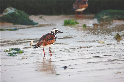 调查人员发现,鸟也跟赶海的人一样会追随潮水。因此,布设铜鼓岭南侧海边样线得提前看好潮汐表,在退潮到最低潮位前后开始调查,穿着普通的水鞋就能轻松蹚过几条水沟,这时候海滩都露出来了,鸻鹬类也来到海滩上觅食,更容易被拍摄到。