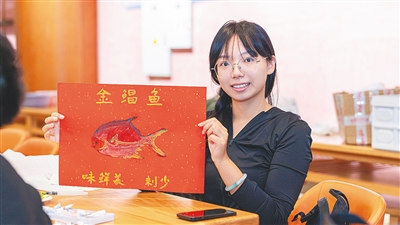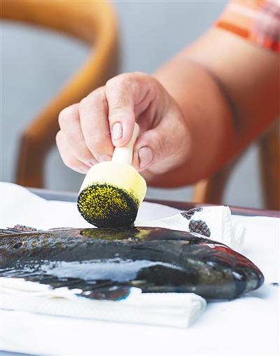 大黄鱼、金鲳鱼、金线鱼、红古鱼、点斑篮子鱼、石斑鱼、黄衣鱼、金枪鱼……19种南海常见的鱼类,成为本次鱼拓画创作的重要原料。参与者将食用色素均匀涂抹于鱼身,而后将喷湿的纸张覆盖鱼身进行拓印,各具特色的鱼拓画就基本完成了。