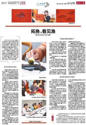 ■ 海南日报全媒体记者 黄媛艳8月16日,2024年三亚崖州开渔节现场,“看见·渔”鱼拓艺术展如约举行,现场的开渔节文创产品中,由当地渔民、儿童自主创作的鱼拓画成为主角,它们成为明信片、手提袋等产品中最别具匠心的设计。