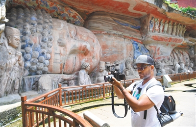 外籍游客在重庆大足石刻景区游览。 新华社发