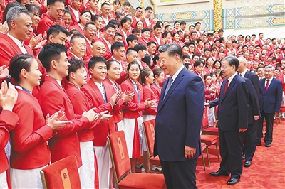 习近平指出,中国体育代表团的优异成绩,将中华体育精神和奥林匹克精神发扬光大,让中华民族精神和时代精神交相辉映,生动诠释了新时代中国精神。赛场上,大家牢记党和人民重托,“国家荣誉永远超过个人”、“我的这块金牌献给伟大的祖国”等誓言掷地有声,展现了祖国至上、为国争光的赤子情怀,展现了顽强拼搏、自强不息的必胜信念,展现了团结协作、并肩作战的宝贵品质,展现了中国青年一代自信乐观、热情友好的阳光气质。你们让全世界看到了中华优秀传统文化的深厚积淀,看到了中国开放包容、昂扬进取的时代风貌,看到了中国人民的志气、锐气和底气。祖国和人民为你们骄傲,为你们点赞。