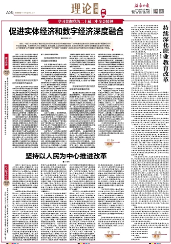 党的二十届三中全会提出“健全促进实体经济和数字经济深度融合制度”“加快构建促进数字经济发展体制机制”等重要任务并作出周密部署。我国多次在国际国内重要会议上宣布,中国自由贸易试验区、海南自由贸易港将深度参与绿色低碳、数字经济等国际合作,主动对接《全面与进步跨太平洋伙伴关系协定》《数字经济伙伴关系协定》。海南作为全国唯一的中国特色自由贸易港,应该在促进实体经济和数字经济深度融合方面走在前、作表率。