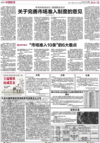 一、完善市场准入负面清单管理模式。由法律、行政法规、国务院决定、地方性法规设定的市场准入管理措施,省、自治区、直辖市政府规章依法设定的临时性市场准入管理措施,全部列入全国统一的市场准入负面清单。各类按要求编制的全国层面准入类清单目录和产业政策、投资政策、环境政策、国土空间规划等涉及市场准入的,全部纳入市场准入负面清单管理,各类经营主体可依法平等进入清单之外的领域。严禁在清单之外违规设立准入许可、违规增设准入条件、自行制定市场准入性质的负面清单,或者在实施特许经营、指定经营、检测认证等过程中违规设置准入障碍。市场准入负面清单实行动态调整,清单事项内容、主管部门等向社会全面公开。