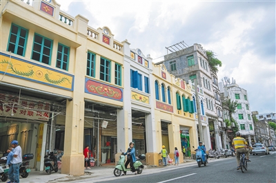 8月21日,在海口骑楼历史文化街区博爱路保护修缮项目施工现场,修缮后的建筑令人眼前一亮。目前,该项目示范段工程已经处于收尾阶段。据了解,该项目涉及建筑254栋,完工后,有助于提升该区域旅游接待能力。海南日报全媒体记者 李天平 摄