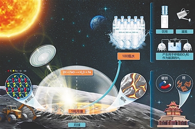 基于上述研究成果,研究团队进一步提出一种“熔融月壤—水蒸气冷凝成水收集储存—电分解水产生氧气和氢气—留存的铁和月壤用作永磁和软磁材料、电子材料、建筑材料等”的月球水资源原位开采与利用策略。研究人员表示,该策略将为未来月球科研站以及空间站建设提供重要的设计依据,并有望在后续的嫦娥探月任务中发射验证性设备以完成进一步确认。