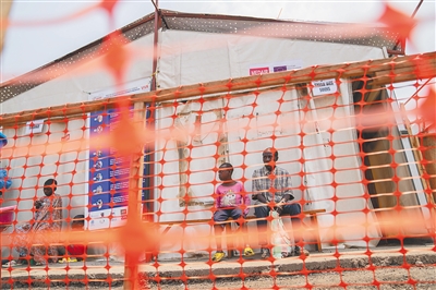 感染猴痘病毒的儿童在刚果一处医疗中心外等待接受治疗。