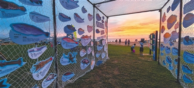 智渔还在海滩上堆了一座“鱼山”:几个90厘米高的正方体堆在一起,每个正方体的每一面都是荣山寮渔获的照片,乍一眼看上去就像是成堆的鱼。这也是对应村里的习惯——捕鱼回来就将渔获一筐一筐地倒在沙滩上,堆积成“小山”。