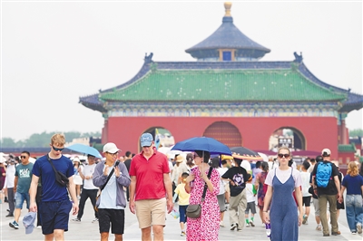 在北京天坛公园内,几名外国游客在导游(前左二)的带领下参观游览。(本栏图片均由新华社发)