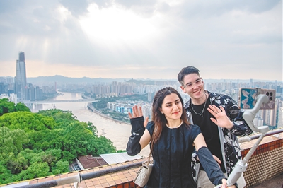 在重庆鹅岭公园,来自俄罗斯的伊利亚(右)和来自巴基斯坦的明月在录制关于重庆景色的视频。