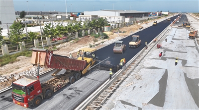 近日,在洋浦经济开发区疏港大道一期扩建及西延线工程施工现场,工人正在加紧铺设沥青。目前,该项目已进入收尾施工阶段,预计9月实现功能性通车,将为洋浦国际集装箱码头货物运输搭上更加高效便捷交通“新动脉”。海南日报全媒体记者 陈元才 摄