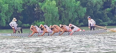 在三亚河上,海南龙舟队选手们一边喊着口号,一边共同发力划桨,龙舟快速穿行于河水中。一场训练下来,海南龙舟运动员们汗流浃背。