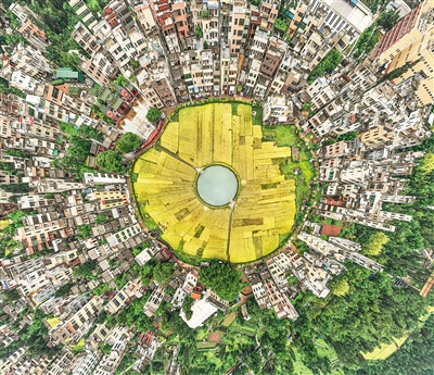 海口市秀英区文毓村的金色稻田,状如向日葵。