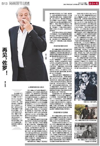 ■ 张意薇在法国影坛乃至全球电影史上,阿兰·德隆(1935年11月8日—2024年8月18日)无疑是一位传奇人物。他俊朗的面孔、深邃的眼神以及独特的个人魅力,使他在全世界范围内赢得了无数粉丝的喜爱。对于许多中国观众来说,阿兰·德隆不仅是一位杰出的演员,他扮演的经典角色——佐罗更是深入人心,那位剑术高超、行侠仗义的蒙面英雄一直是英勇、浪漫和正义的象征。