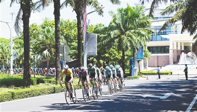 八月二十七日,二〇二四第十五届环海南岛国际公路自行车赛在海南琼海开赛。图为参赛车手途经博鳌亚洲论坛会址。