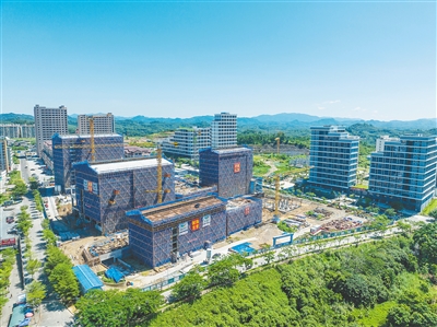 8月27日,俯瞰位于琼中营根镇的海南农信中部金融中心项目(一期)建设现场。该项目正加紧施工,将于下月底实现全面封顶。