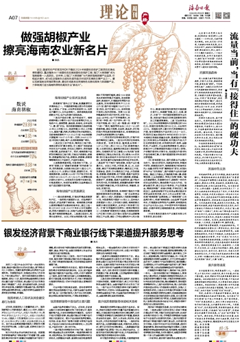 ■ 陈凯近日,国家知识产权局发布《关于确定2024年地理标志保护工程项目实施名单的通知》,重点围绕44个地理标志实施地理标志保护工程,海口“大坡胡椒”成为海南省唯一入选项目。近年来,以海口“大坡胡椒”为代表的海南胡椒产业品质、价格逐步提升,成为拉动海南东北部和东部市县农村经济发展的主要产业之一。建议发挥海南自贸港政策优势,建设形成具有自贸港特色优势和竞争力的胡椒产业,力争将其打造为海南热带特色高效农业“新名片”。