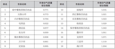 环境空气质量排名靠前的市县分别是琼中黎族苗族自治县、五指山市和白沙黎族自治县,排名靠后的市县分别是海口市、三亚市和文昌市。2024年7月全省18个市县环境空气质量排名如右: