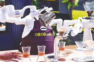 图为一款AI+咖啡大师机器人在冲泡咖啡。