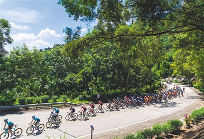 在第三赛段陵水到五指山的比赛中,车手们在爬坡段骑行。海南日报全媒体记者 宋国强 摄