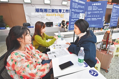 在湖南湘江新区零工市场,求职者(右)向工作人员咨询岗位信息。新华社发