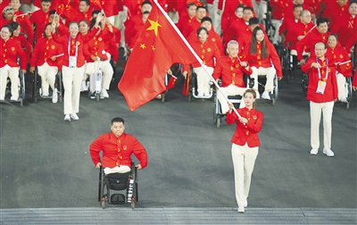 中国体育代表团旗手女子轮椅击剑运动员辜海燕(前右)和男子举重运动员齐勇凯(前左)在开幕式上入场。新华社发