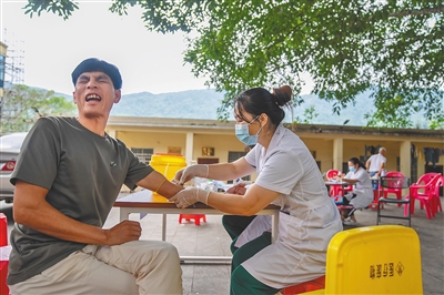 在白沙黎族自治县青松乡拥处村,医务人员为村民抽血,开展疾病筛查。