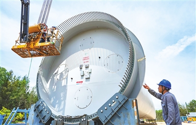 ③在明阳(临高)大型海上风电机组检测试验基地,工作人员对风机叶片安装衔接螺丝,以便起吊装机。